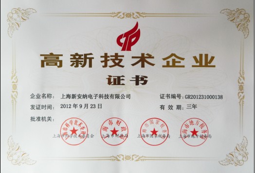 2012/09/23新安納榮獲上海市高新技術(shù)企業(yè)