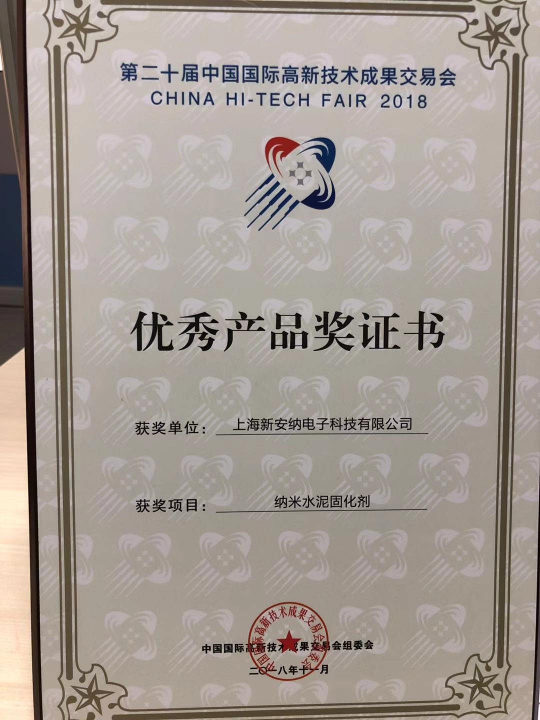 熱烈祝賀上海新安納電子科技有限公司榮獲第二十屆中國(guó)國(guó)際高新技術(shù)成果交易會(huì)“優(yōu)秀產(chǎn)品獎(jiǎng)證書”,獲獎(jiǎng)項(xiàng)目“納米水泥固化劑”。